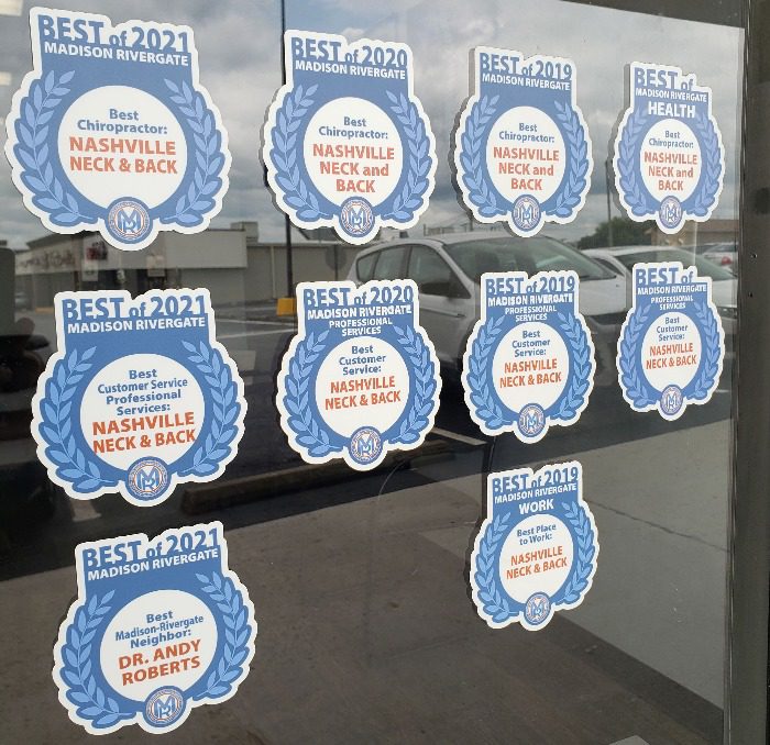 Nashville Neck and Back consistently wins awards in the Madison Rivergate Chamber of Commerce ‘Best of’ yearly award program. The awards are voted on by members of the Madison / Rivergate community. Dr. Roberts has won Best Chiropractor 6 Years in a row!